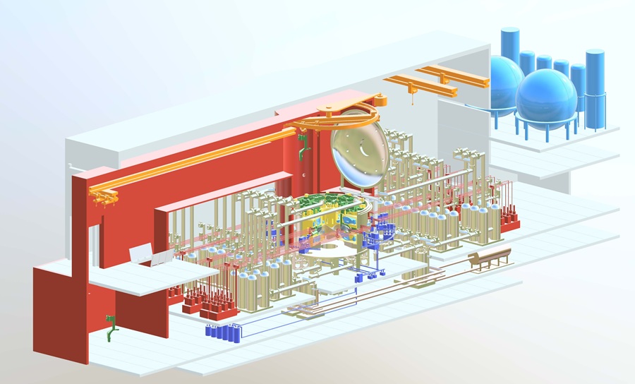 | 图一为Helical Fusion 开发中的全球首座稳态净功率核融合电厂--Helix KANATA的中央剖面示意图,图二为其厂区概念图。(source : Helical Fusion) |