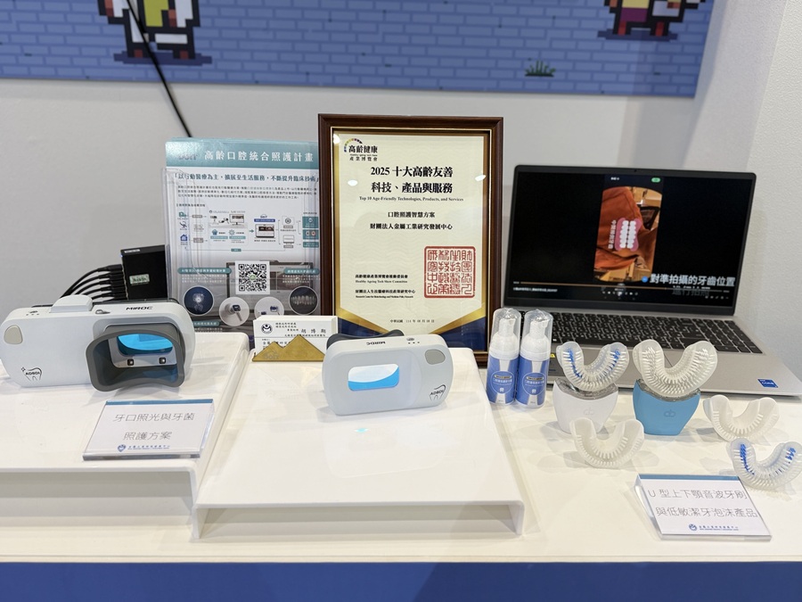 金属中心研发的「囗腔照护暨吞咽赋能智慧方案」,不仅针对长者常见的囗腔清洁与吞咽困难提供完整解决方案,更荣获博览会「十大高龄友善科技奖」肯定。该方案运用AI与非接触式检测技术,能够精准侦测牙菌斑,提供个人化囗腔清洁建议,并设计游戏化的吞咽训练与复健系统,提升长者的自我照护意愿与复健效果。此外,相关技术已成功技转予台??重工与台塑生医,并串联高露洁、北昕资讯等产业资源,推动长照机构应用落地。