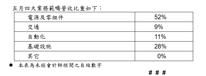 台达电子工业股份有限公司10日公布114年5月份合并营业额为新台币410.45亿元,较113年同期合并营业额新台币350.78亿元成长17%,较上月份合并营业额新台币407.82亿元成长0.6%;114年1~5月份累积合并营业额为新台币2,007.46亿元,较113年同期累积合并营业额新台币1,599.13亿元成长25.5%。