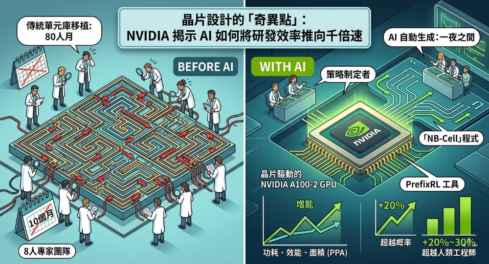 在半导体制程向 2 奈米、18A 甚至更先进节点迈进的当下,设计复杂度正呈几何级数增长。然而,NVIDIA 首席研究员 Bill Dally 近期揭露的一项技术突破,可能彻底改写晶片开发的游戏规则。透过 AI 驱动的自动化工具,原本需要数月完成的繁重工作,现在缩短至一夜之间,标志着电子设计自动化(EDA)领域正式进入由 AI 主导的统治时代。