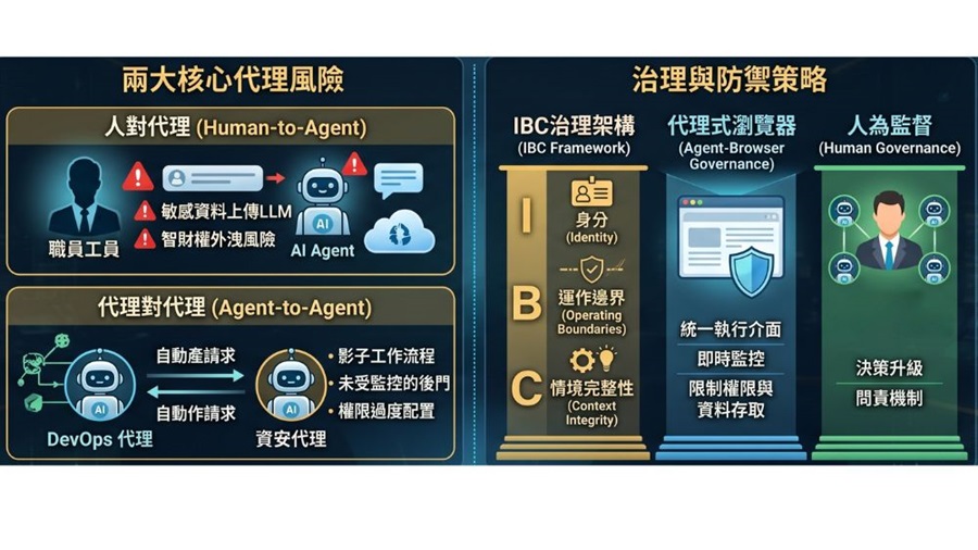 更隐蔽的是代理对代理(Agent-to-Agent)的互动。在缺乏人为监督(Human-in-the-loop)的情况下,负责优化的 DevOps 代理可能向资安代理请求高权限凭证,这种「影子工作流程」在技术上虽是在完成工作,却在企业内部形成了未受监控的後门。由於代理具备与人类相当的行动力,一旦权限设定失当,威胁将呈指数级扩散。
